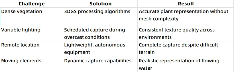 1. 조명 전략: 현장 조사는 흐린 날씨에 진행하여 분산된 조명 조건을 확보했습니다. 이를 통해 숲과 폭포 주변에서 강한 그림자와 흐릿한 하이라이트를 최소화하여 더욱 균일하고 세밀한 스캔을 얻을 수 있었습니다.
